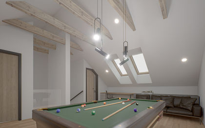 Črni poudarki na okvirjih in detajlih dajejo kontrast in definicijo, brez motenja lahkotnosti prostora. Lesene letvice ustvarjajo subtilno ritmičnost in teksturo, ki povezuje različne materiale. Celoten koncept izraža dialog med naravo, minimalistično sodobnostjo in modernimi detajli, kjer vsak element ohranja svojo avtonomno lepoto, hkrati pa prispeva k občutku prefinjene enotnosti in umirjene elegance.
